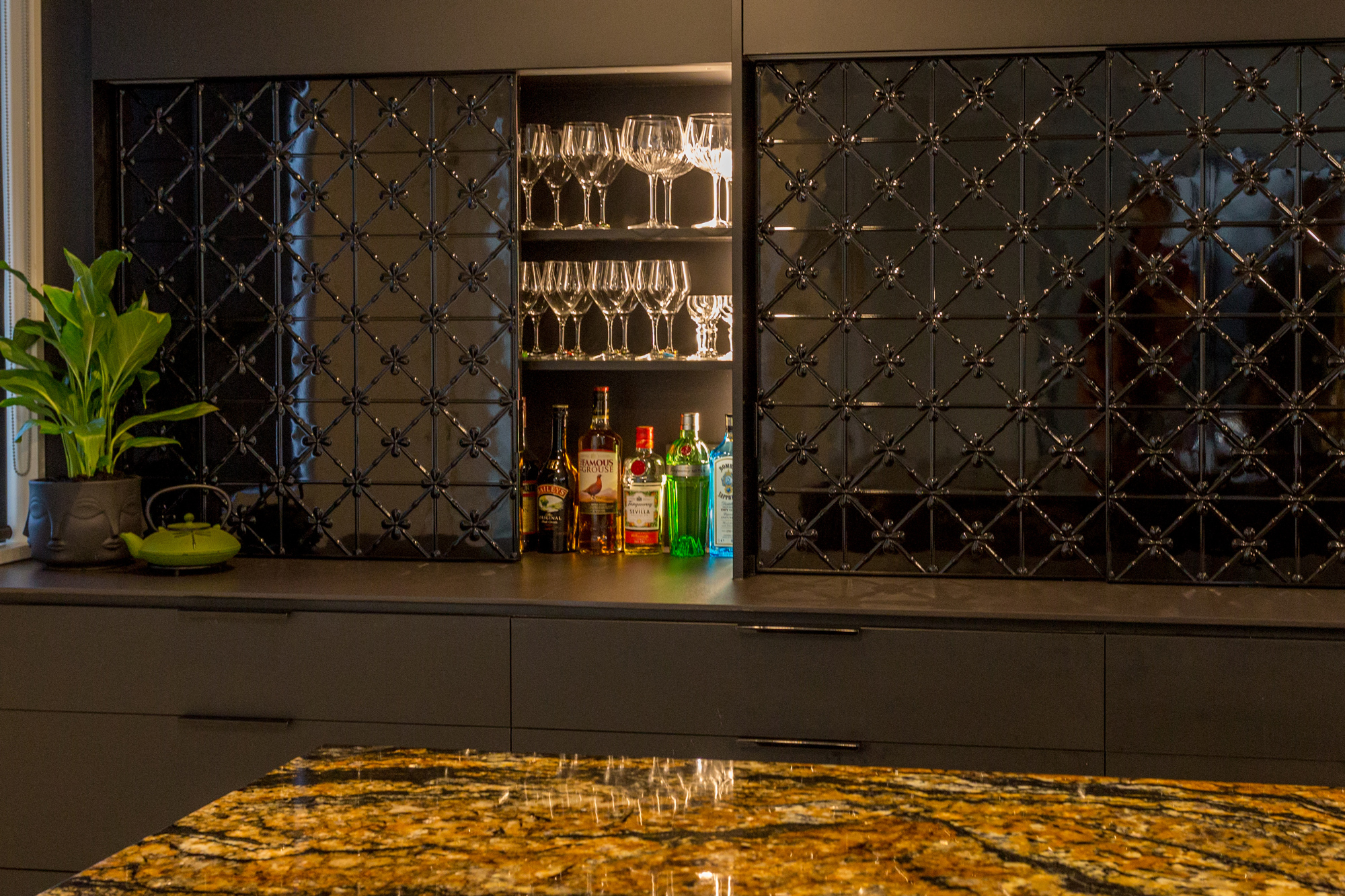 Feature Cabinets – Pressed tin finished in black gloss 2 pot lacquer 100%