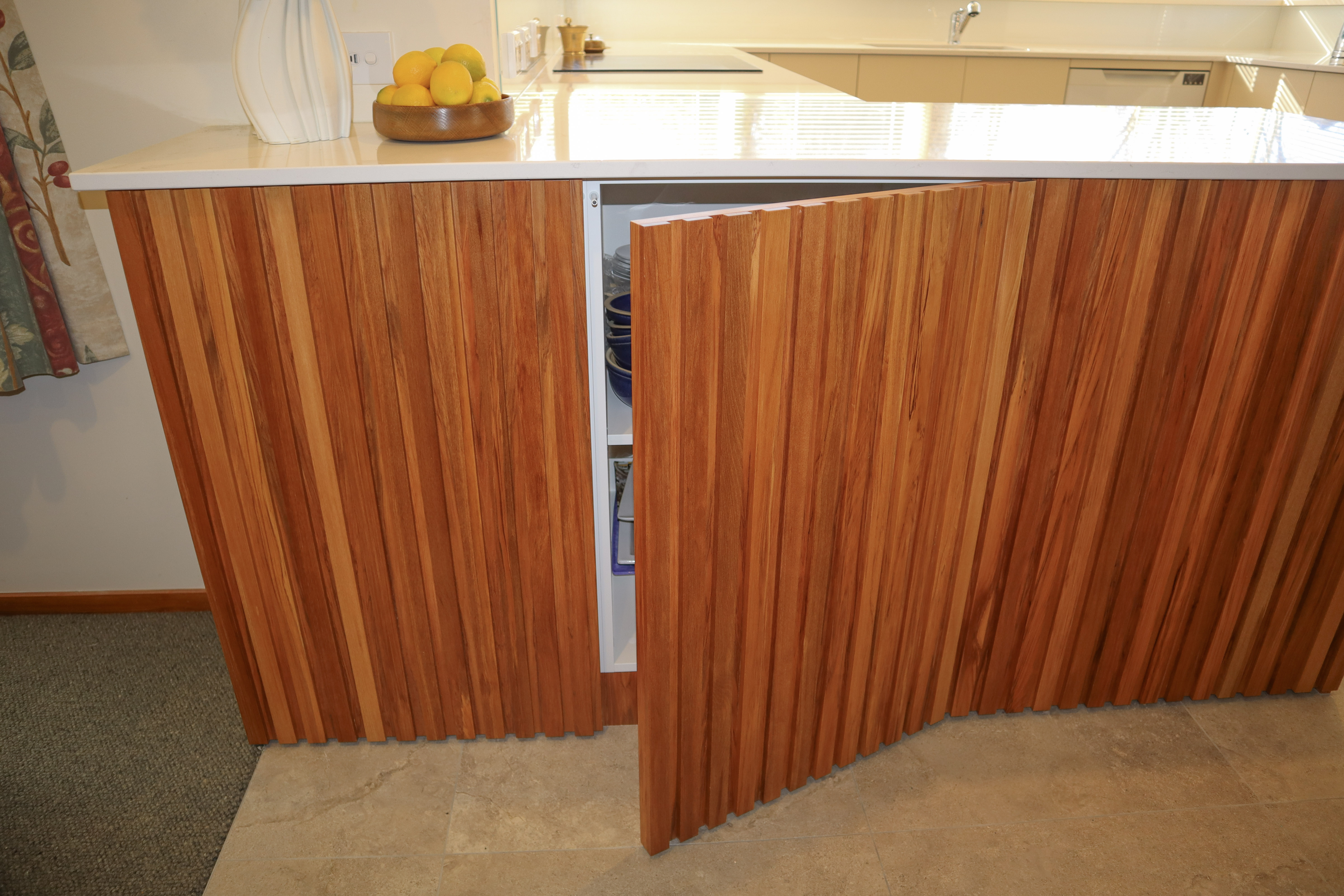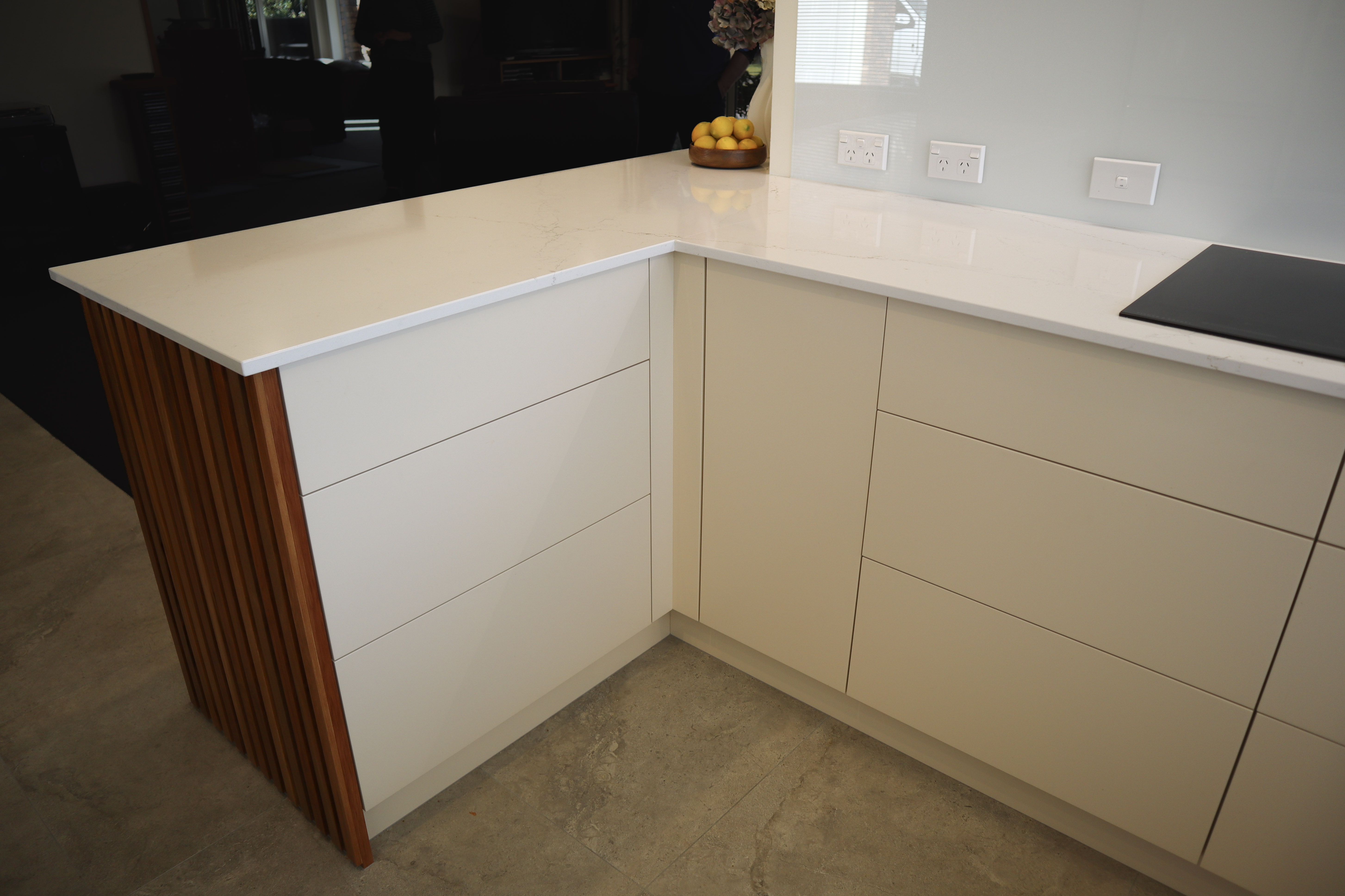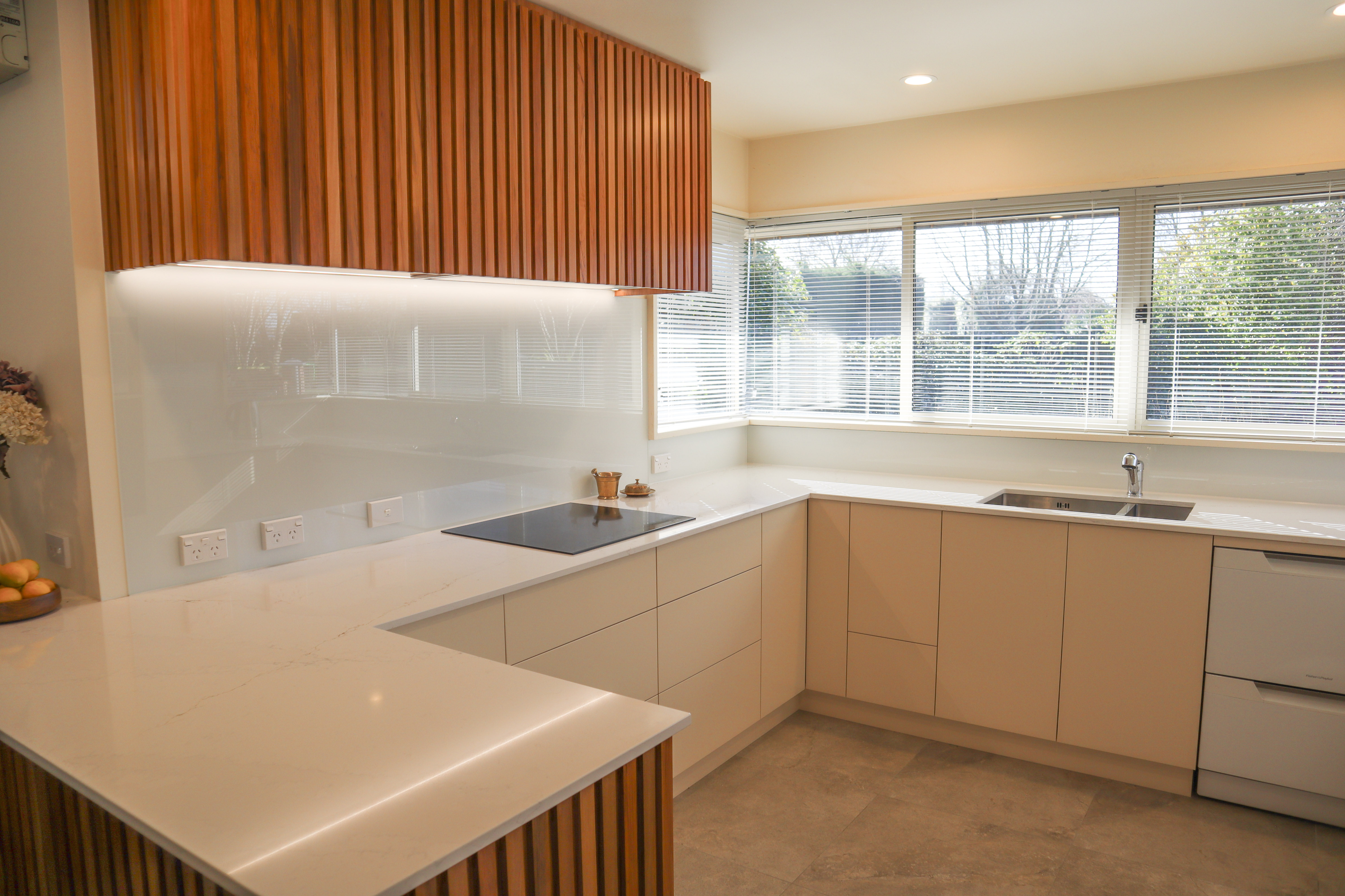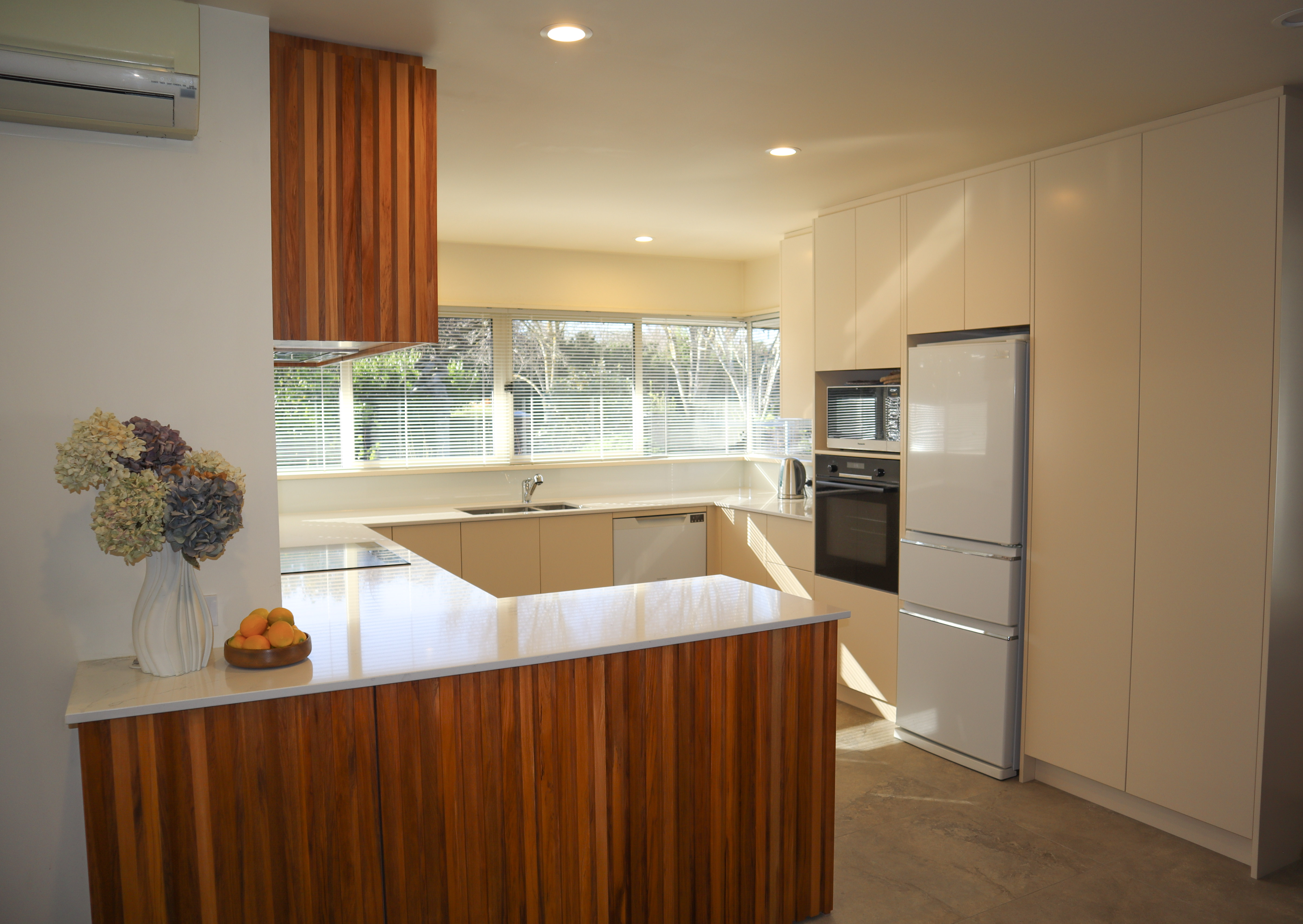 Cabinetry – Two-pot lacquer, 30% gloss finish in Dulux raw cotton and Rimu veneer for wall cabinetry & base peninsula island rear cabinetry, bar back and end panel